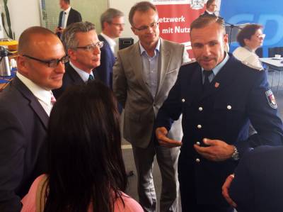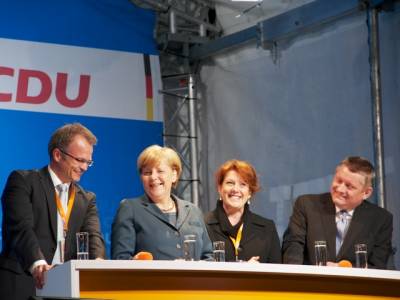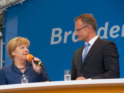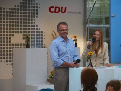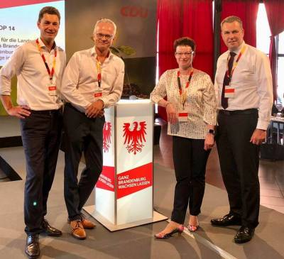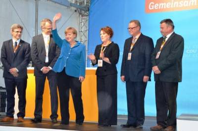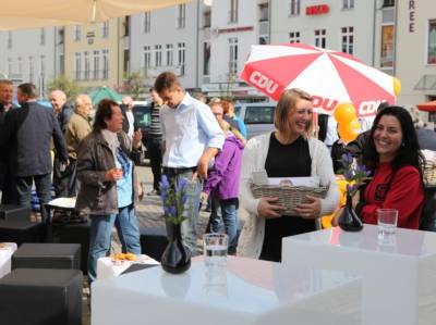 Bundeskanzlerin Angela Merkel, Landesvorsitzender Michael Schierack, Generalsekretärin Anja Heinrich, Spitzenkandidat Michael Stübgen, Bundestagskandidat Dr. Klaus Peter Schulze und Bürgermeister Jörg Gampe bedanken sich bei den Teilnehmern
