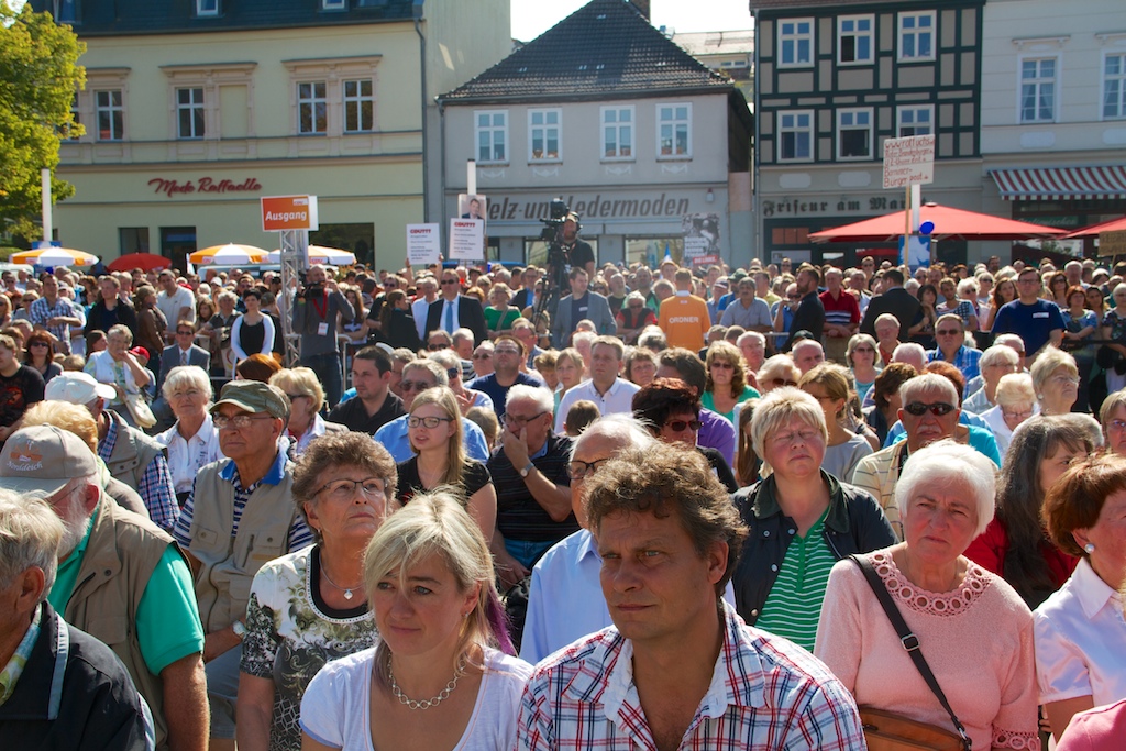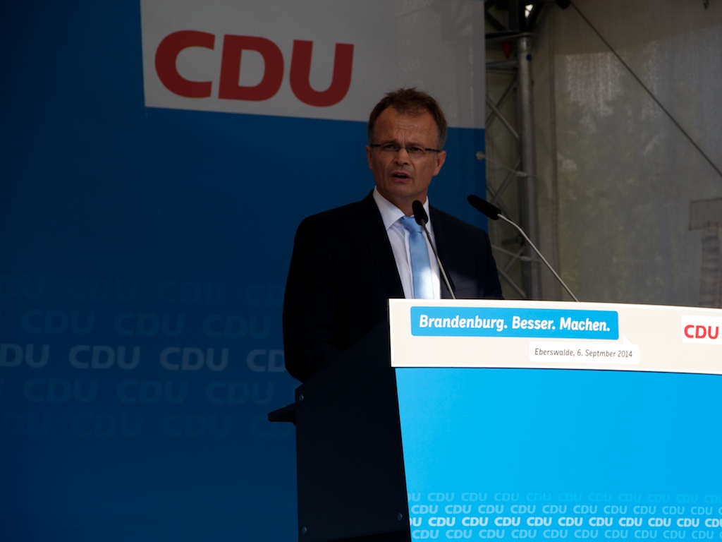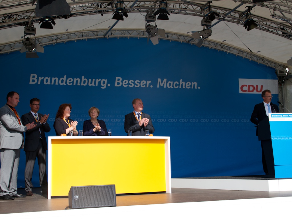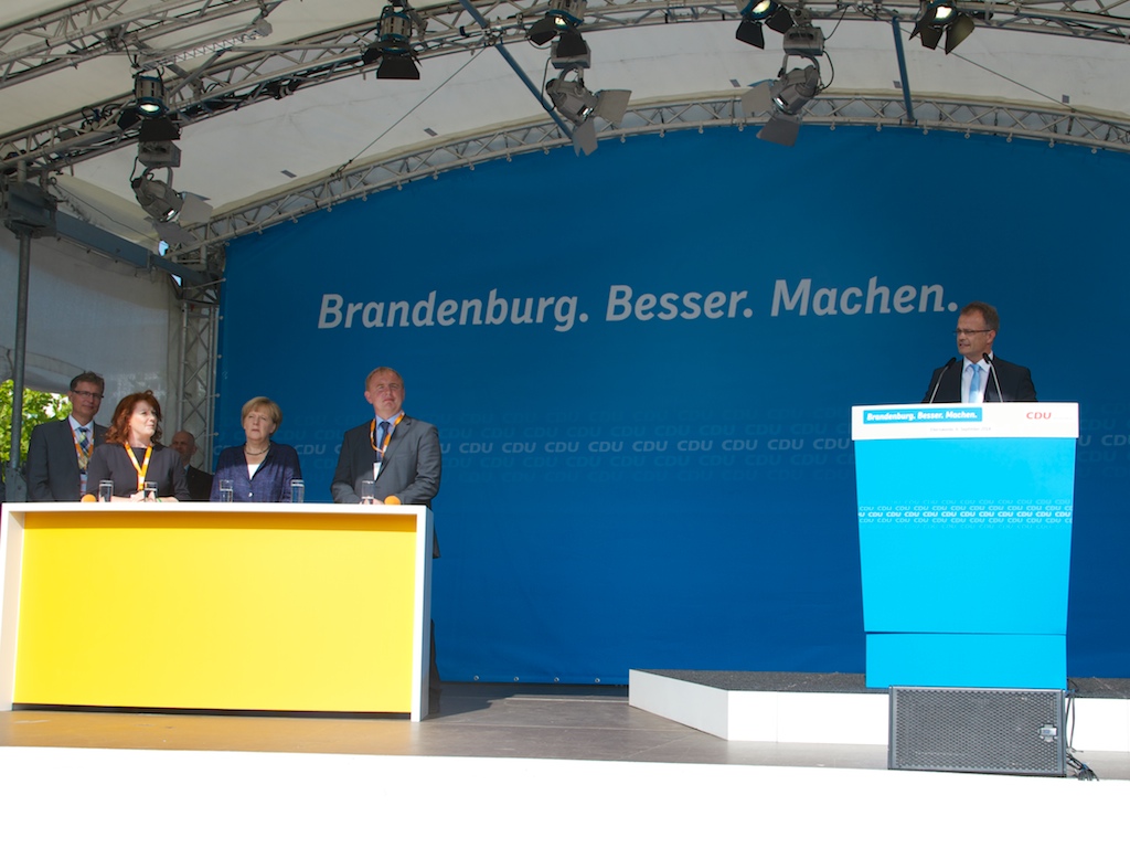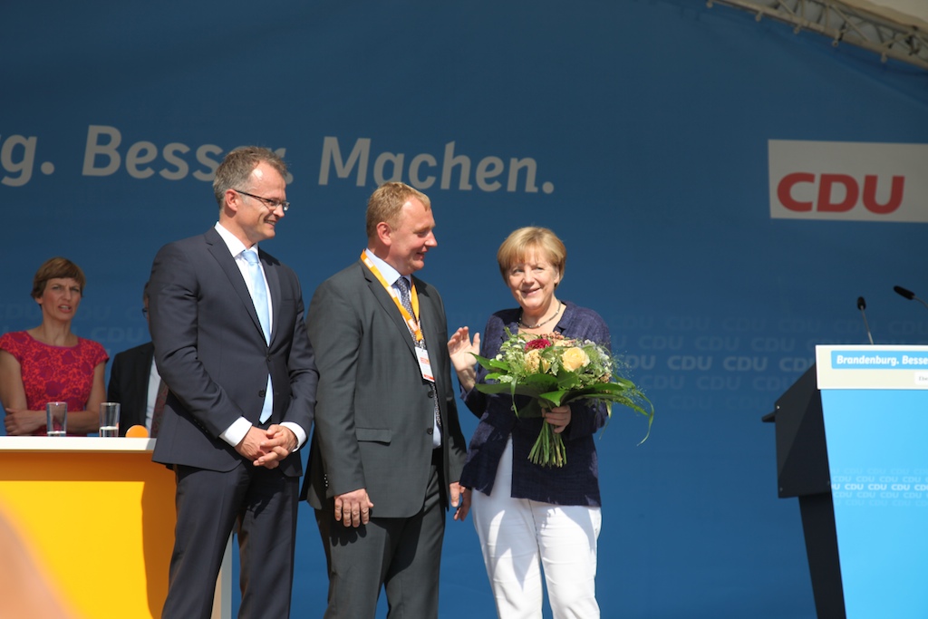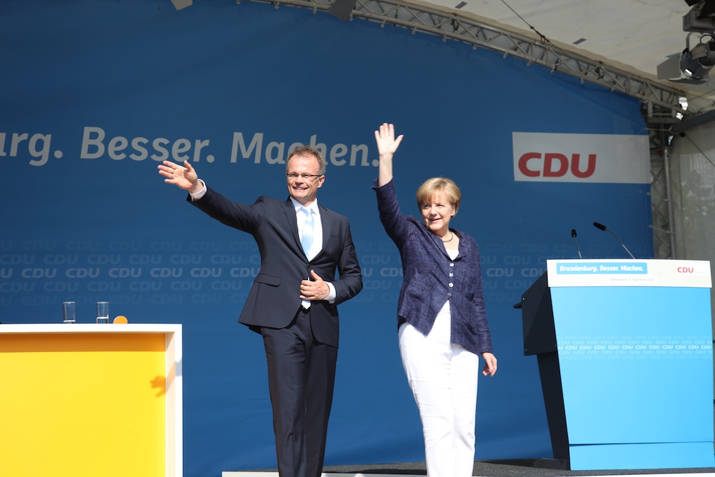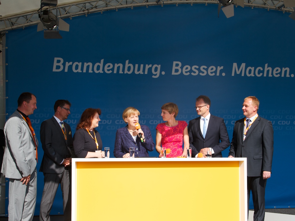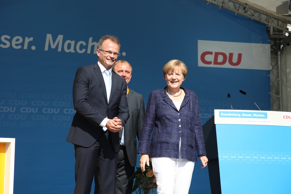 Bei einem Wahlkampfauftritt in Eberswalde warb Angela Merkel für die CDU Brandenburg und den CDU-Spitzenkandidaten Michael Schierack zur Landtagswahl am 14. September. Vor mehr als 2.000 Teilnehmern betonte er: Wir wollen Rot-Rot ablösen, das sind wir dem Land schuldig. Die Menschen, denen ich täglich begegne, wollen ein besseres Brandenburg. Bessere Bildung, mehr Sicherheit und gute Straßen.
