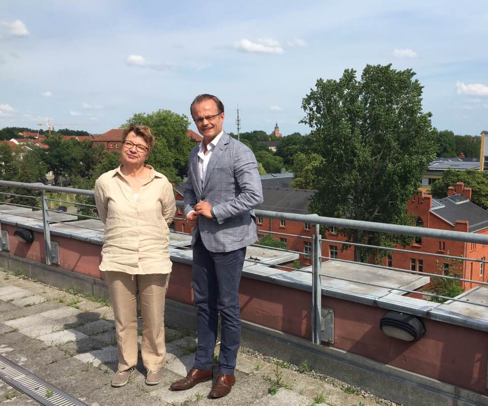 Als wissenschaftspolitischer Sprecher ist es wichtig, regelmäßig mit unseren Hochschulen und Instituten informelle Gespräche zu führen. Am Ende des Gespräches führt mich die Präsidentin Frau Prof. Dr.-Ing. Burghilde Wieneke-Toutaoui, gegenwärtig auch Vorsitzende der Brandenburgischen Landesrektorenkonferenz, auf die Terrasse des Hauptgebäudes der Hochschule, um einen sommerlichen Blick auf den Campus werfen zu können.
