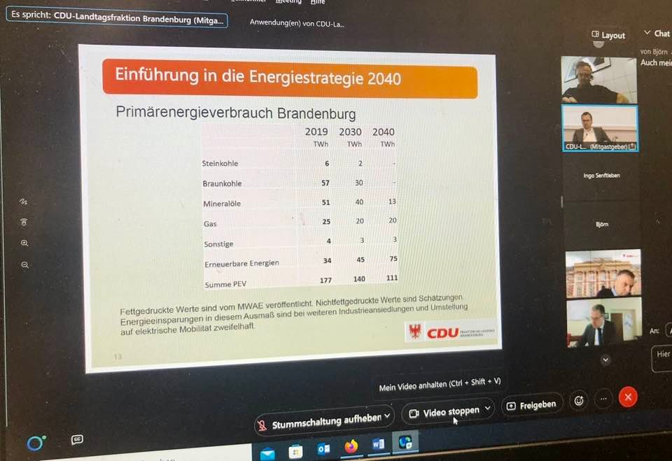 Im Mittelpunkt stand die Diskussion zum Entwurf der Energiestrategie für das Land Brandenburg 2040. Wir sehen als Fraktion noch einen großen Diskussionsbedarf und sehen einige Aussagen dazu kritisch auch im Hinblick auf eine mögliche veränderte Strategie der neuen Bundesregierung.